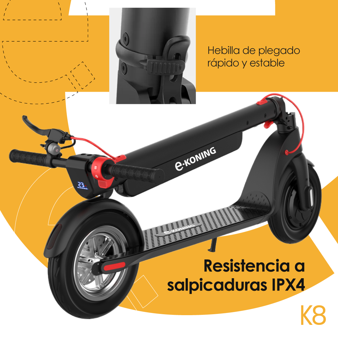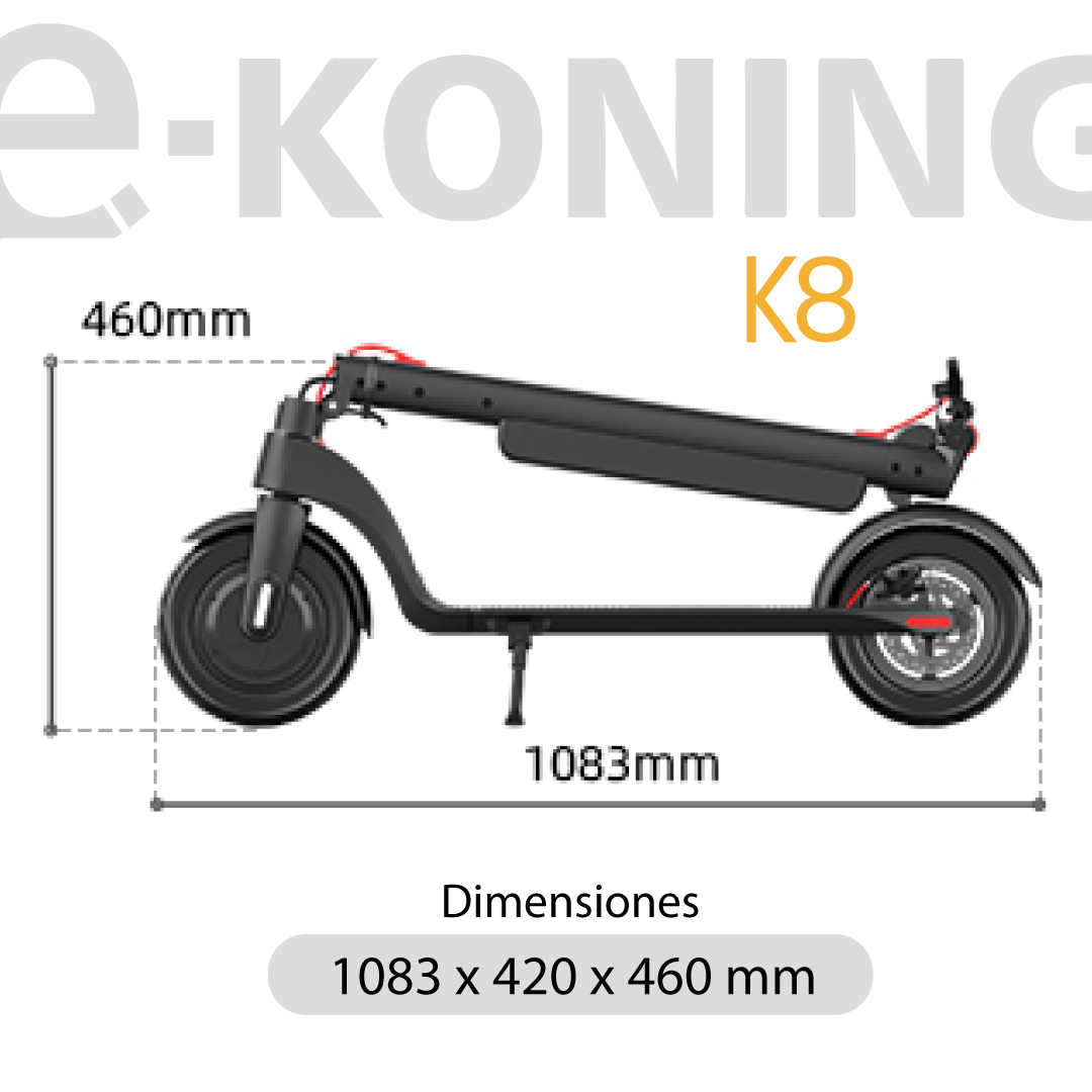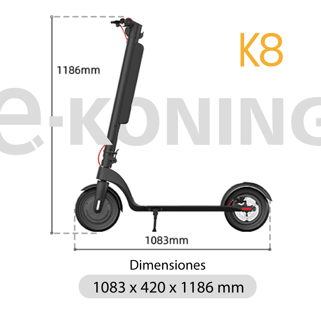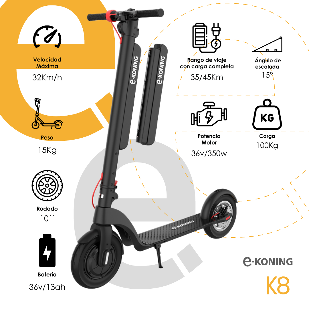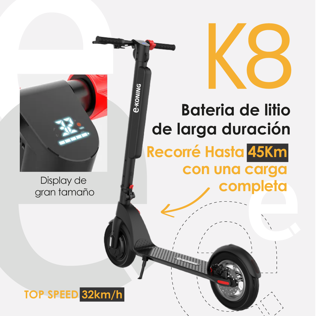 El monopatín eléctrico e-koning K8 redefine la movilidad urbana con su velocidad máxima de 25 km/h y una impresionante autonomía de 45 km. Diseñado para usuarios de 14 años en adelante, este modelo combina tecnología avanzada con un diseño plegable que facilita su transporte y almacenamiento.