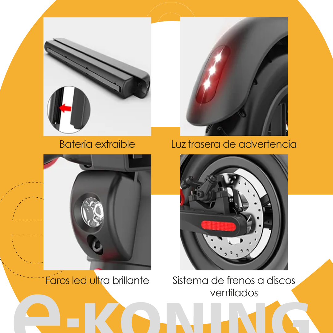 Las ruedas de 10 pulgadas y el sistema de frenos de disco ofrecen una conducción segura y estable en diversas superficies. Además, las luces LED garantizan visibilidad en condiciones de poca luz, mejorando la seguridad del usuario.
